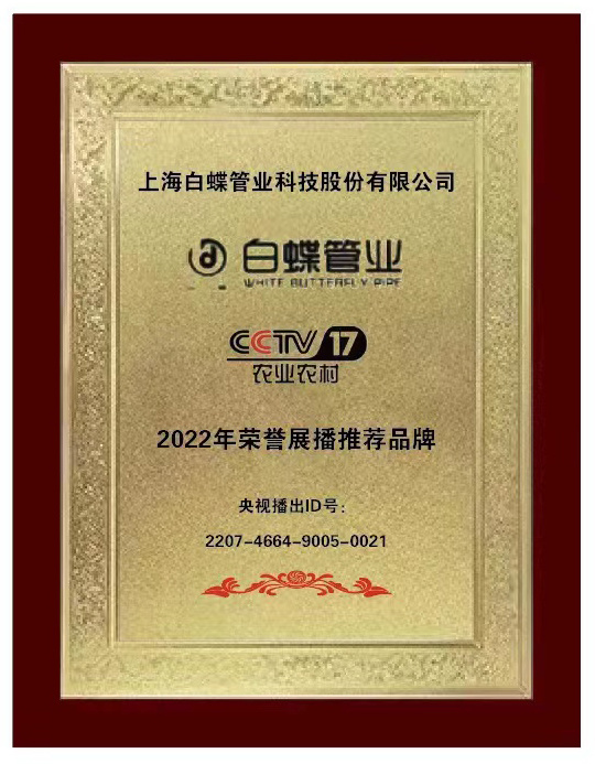 上海白蝶作为塑料管道行业强有力的领先品牌,无论在产品性能表现还是服务管理体系上,都称得上行业标杆,入选央视展播品牌当之无愧。在CCTV-7/CCTV-17两个频道隆重播出,央视的背书,亿万观众的关注,让上海白蝶品牌的曝光度和影响力将达到空前的高度。