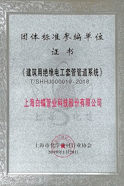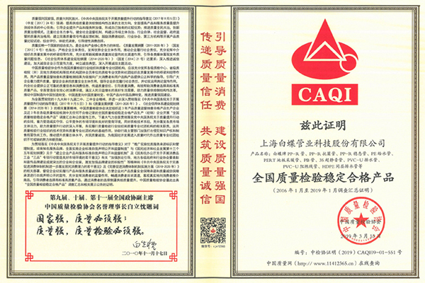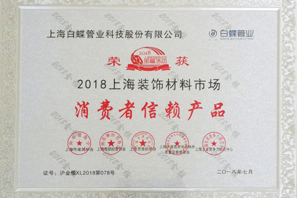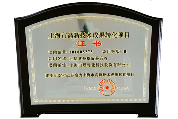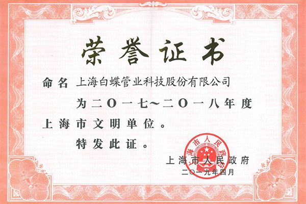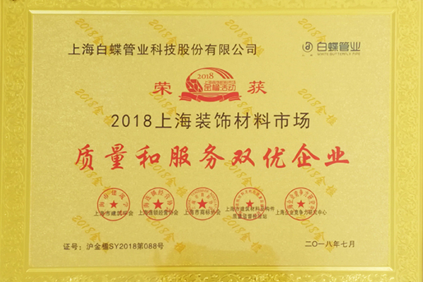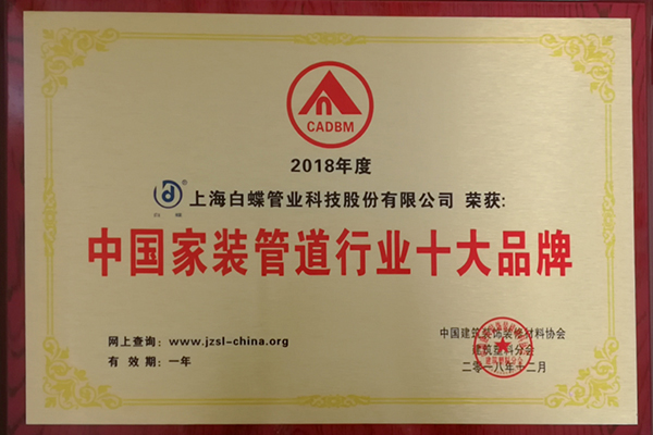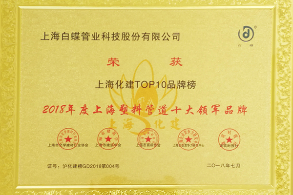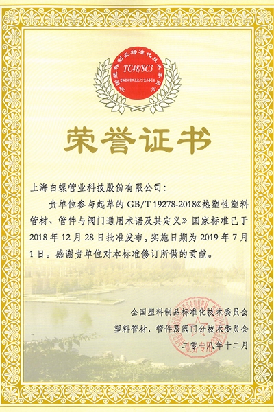 上海白蝶是中国塑料管道专业委员会副理事长单位,全国塑料制品标准化技术委员会(TC 48/SC3)核心委员单位,国家标准化管理委员第七届全国塑料标准化技术委员会石化塑料树脂产品分技术委员会(SAC/TC15/SC1)委员成员,塑料加工工业协会专家成员。上海市高新技术企业认定;上海市著名商标;上海市名牌产品;上海市守合同重信用企业;上海市守合同重信用等级为AAA级;上海市文明单位;上海市“企业诚信创建”活动组委会《五星级诚信创建企业》;上海市平安单位;中国塑料行业二十强企业;中国管业十大品牌;上海化建匠心企业;上海市化学建材行业协会《上海化建TOP 品牌榜——上海塑料管道十大领军品牌》;上海市房屋修建行业协会《2020年度上海市住宅修缮工程材料推优产品》;中国质量检验协会《2018年3月至2021年2月全国质量检验稳定合格产品》;中国质量检验协会《2021年3.15全国产品和服务质量诚信示范企业》;中国质量检验协会《2018年7月至2021年6月全国塑料管道行业质量领先品牌》;中国质量检验协会《2018年7月至2021年6月全国塑料管道行业质量领先企业》;中国质量检验协会《2018年7月至2021年6月全国质量信誉保障产品》;上海市房屋修建行业协会《2020年度上海市住宅修缮工程材料推优单位及产品名称》;中国建筑装饰装修材料协会建筑塑料分会《中国家装管道行业十大品牌证书》;《GB T18742.1-2017冷热水用聚丙烯管道系统 第1部分总则》国家标准白蝶公司参与起草修订贡献奖;《GB T18742.2-2017冷热水用聚丙烯管道系统 第2部分管材》国家标准白蝶公司参与起草修订贡献奖;《GB T18742.3-2017冷热水用聚丙烯管道系统 第3部分管件》国家标准白蝶公司参与起草修订贡献奖;《GB T32434-2015 PE管材及管件热熔对接程序》参与起草标准贡献奖等荣誉。公司已获专利59项:其中:发明专利为3项;实用新型专利为56项。