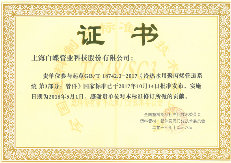 PPR国家标准起草证书