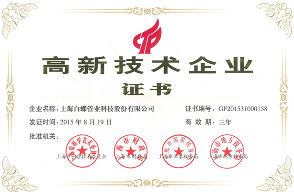 上海白蝶是中国塑料管道专业委员会副理事长单位,全国塑料制品标准化技术委员会(TC 48/SC3)核心委员单位,国家标准化管理委员第七届全国塑料标准化技术委员会石化塑料树脂产品分技术委员会(SAC/TC15/SC1)委员成员,塑料加工工业协会专家成员。上海市高新技术企业认定;上海市商标;上海市名牌产品;上海市守合同重信用企业;上海市守合同重信用等级为AAA级;上海市文明单位;上海市“企业诚信创建”活动组委会《五星级诚信创建企业》;上海市平安单位;中国塑料行业企业;中国管业十大品牌;上海化建匠心企业;上海市化学建材行业协会《上海化建TOP 品牌榜——上海塑料管道十大领军品牌》;上海市房屋修建行业协会《2020年度上海市住宅修缮工程材料推优产品》;中国质量检验协会《2018年3月至2021年2月全国质量检验稳定合格产品》;中国质量检验协会《2021年3.15全国产品和服务质量诚信示范企业》;中国质量检验协会《2018年7月至2021年6月全国塑料管道行业质量品牌》;中国质量检验协会《2018年7月至2021年6月全国塑料管道行业质量企业》;中国质量检验协会《2018年7月至2021年6月全国质量信誉保障产品》;上海市房屋修建行业协会《2020年度上海市住宅修缮工程材料推优单位及产品名称》;中国建筑装饰装修材料协会建筑塑料分会《中国家装管道行业十大品牌证书》;《GB T18742.1-2017冷热水用聚丙烯管道系统 第1部分总则》国家标准白蝶公司参与起草修订贡献奖;《GB T18742.2-2017冷热水用聚丙烯管道系统 第2部分管材》国家标准白蝶公司参与起草修订贡献奖;《GB T18742.3-2017冷热水用聚丙烯管道系统 第3部分管件》国家标准白蝶公司参与起草修订贡献奖;《GB T32434-2015 PE管材及管件热熔对接程序》参与起草标准贡献奖等荣誉。公司已获专利59项:其中:发明专利为3项;实用新型专利为56项。