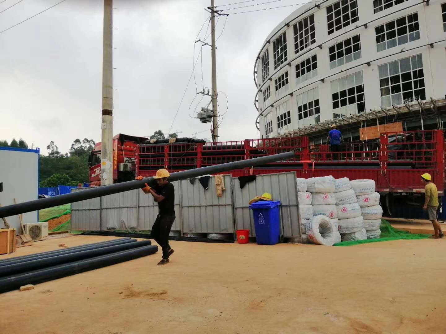 9月4日一早,南宁东盟国际生物科技谷项目施工现场,一辆满载“白蝶牌”地源热泵材料的大卡缓缓驶入,指挥人员开始安排有序卸货,随着项目临近尾声,这也是白蝶管业为该项目供应的最后一批管材。