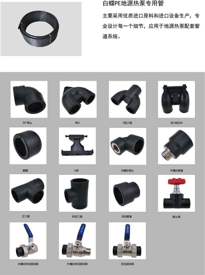主要采用优质进口原料和进口设备生产,专业设计每一个细节,应用于地源热泵配套管道系统。