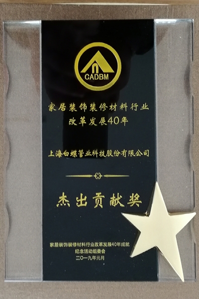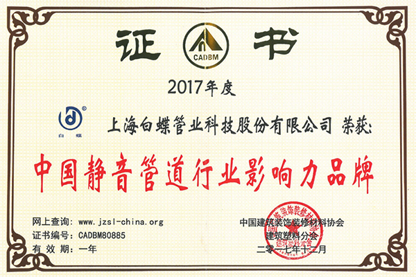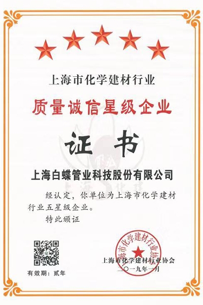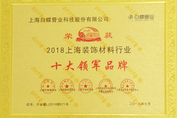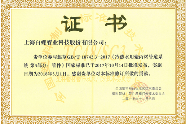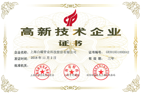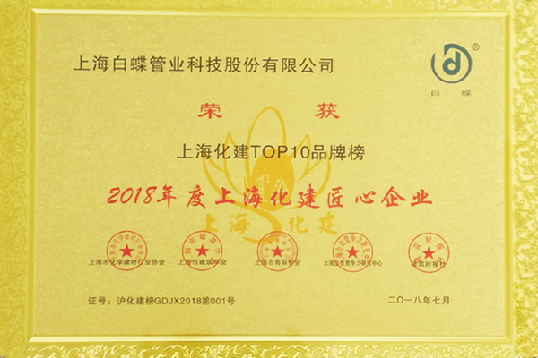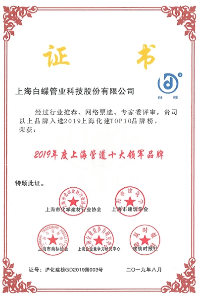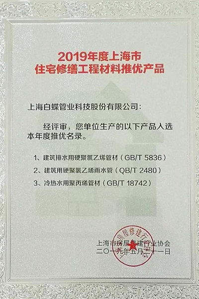 上海白蝶是中国塑料管道专业委员会副理事长单位,全国塑料制品标准化技术委员会(TC 48/SC3)核心委员单位,国家标准化管理委员第七届全国塑料标准化技术委员会石化塑料树脂产品分技术委员会(SAC/TC15/SC1)委员成员,塑料加工工业协会专家成员。上海市高新技术企业认定;上海市著名商标;上海市名牌产品;上海市守合同重信用企业;上海市守合同重信用等级为AAA级;上海市文明单位;上海市“企业诚信创建”活动组委会《五星级诚信创建企业》;上海市平安单位;中国塑料行业二十强企业;中国管业十大品牌;上海化建匠心企业;上海市化学建材行业协会《上海化建TOP 品牌榜——上海塑料管道十大领军品牌》;上海市房屋修建行业协会《2020年度上海市住宅修缮工程材料推优产品》;中国质量检验协会《2018年3月至2021年2月全国质量检验稳定合格产品》;中国质量检验协会《2021年3.15全国产品和服务质量诚信示范企业》;中国质量检验协会《2018年7月至2021年6月全国塑料管道行业质量领先品牌》;中国质量检验协会《2018年7月至2021年6月全国塑料管道行业质量领先企业》;中国质量检验协会《2018年7月至2021年6月全国质量信誉保障产品》;上海市房屋修建行业协会《2020年度上海市住宅修缮工程材料推优单位及产品名称》;中国建筑装饰装修材料协会建筑塑料分会《中国家装管道行业十大品牌证书》;《GB T18742.1-2017冷热水用聚丙烯管道系统 第1部分总则》国家标准白蝶公司参与起草修订贡献奖;《GB T18742.2-2017冷热水用聚丙烯管道系统 第2部分管材》国家标准白蝶公司参与起草修订贡献奖;《GB T18742.3-2017冷热水用聚丙烯管道系统 第3部分管件》国家标准白蝶公司参与起草修订贡献奖;《GB T32434-2015 PE管材及管件热熔对接程序》参与起草标准贡献奖等荣誉。公司已获专利59项:其中:发明专利为3项;实用新型专利为56项。
