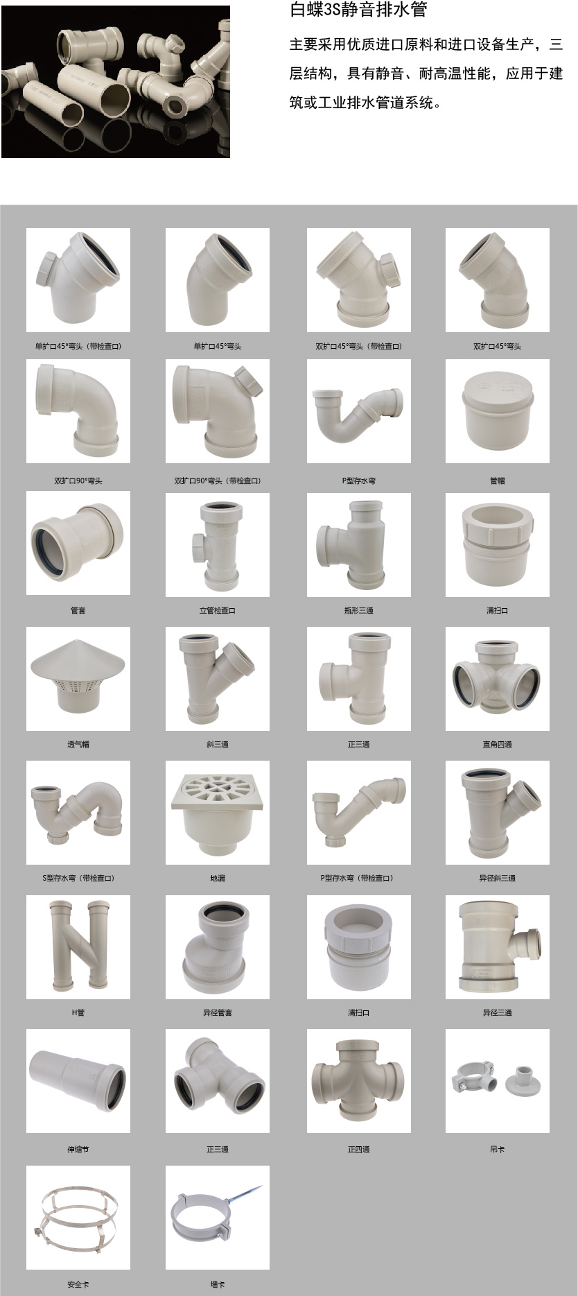 主要采用优质进口原料和进口设备生产,三层结构,具有静音、耐高温性能,应用于建筑或工业排水管道系统。