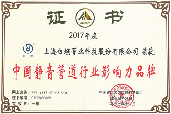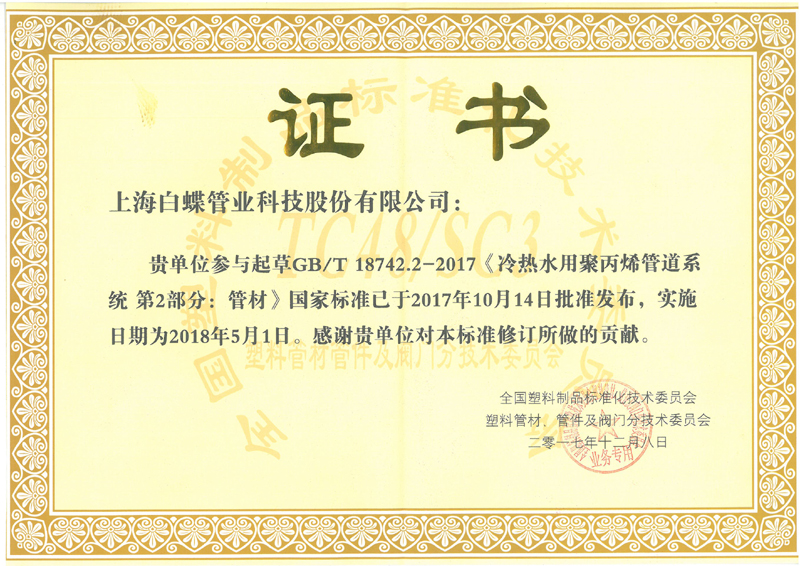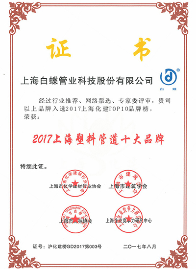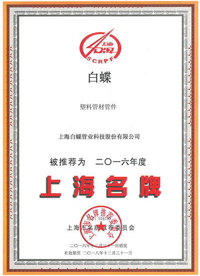 上海白蝶是中国塑料管道专业委员会副理事长单位,全国塑料制品标准化技术委员会(TC 48/SC3)核心委员单位,国家标准化管理委员第七届全国塑料标准化技术委员会石化塑料树脂产品分技术委员会(SAC/TC15/SC1)委员成员,塑料加工工业协会专家成员。上海市高新技术企业认定;上海市商标;上海市名牌产品;上海市守合同重信用企业;上海市守合同重信用等级为AAA级;上海市文明单位;上海市“企业诚信创建”活动组委会《五星级诚信创建企业》;上海市平安单位;中国塑料行业企业;中国管业十大品牌;上海化建匠心企业;上海市化学建材行业协会《上海化建TOP 品牌榜——上海塑料管道十大领军品牌》;上海市房屋修建行业协会《2020年度上海市住宅修缮工程材料推优产品》;中国质量检验协会《2018年3月至2021年2月全国质量检验稳定合格产品》;中国质量检验协会《2021年3.15全国产品和服务质量诚信示范企业》;中国质量检验协会《2018年7月至2021年6月全国塑料管道行业质量品牌》;中国质量检验协会《2018年7月至2021年6月全国塑料管道行业质量企业》;中国质量检验协会《2018年7月至2021年6月全国质量信誉保障产品》;上海市房屋修建行业协会《2020年度上海市住宅修缮工程材料推优单位及产品名称》;中国建筑装饰装修材料协会建筑塑料分会《中国家装管道行业十大品牌证书》;《GB T18742.1-2017冷热水用聚丙烯管道系统 第1部分总则》国家标准白蝶公司参与起草修订贡献奖;《GB T18742.2-2017冷热水用聚丙烯管道系统 第2部分管材》国家标准白蝶公司参与起草修订贡献奖;《GB T18742.3-2017冷热水用聚丙烯管道系统 第3部分管件》国家标准白蝶公司参与起草修订贡献奖;《GB T32434-2015 PE管材及管件热熔对接程序》参与起草标准贡献奖等荣誉。公司已获专利59项:其中:发明专利为3项;实用新型专利为56项。