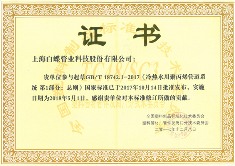 PPR国家标准起草证书