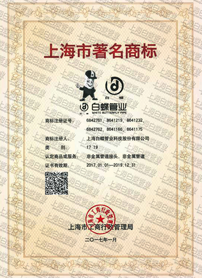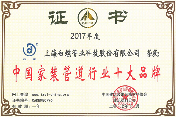 上海白蝶管业科技股份有限公司是一家国有大型控股企业。专业从事塑料管道研发、生产、销售三十余年,在上海金汇、浦东航头、黑龙江肇东等地均建有生产基地。生产产品有给水管、排水管、穿线管、地暖管、采暖管、地源热泵等六大类,共18款单品。白蝶是我国PPR管研发生产的重要厂家,是国内PP-R管道行业的开拓者,曾连续多年被评为中国十大品牌、消费者信赖品牌、上海知名品牌、是上海市高新技术企业,中国塑料管道专业委员会副理事长单位,三项管道国家标准起草单位。秉承“让客户放心”理念,连续30多年坚持采用国际进口原料和生产设备,产品遍布全国300多座城市,拥有经销商1000多家,并且亚欧非等国家,只为让消费者用上放心水管。